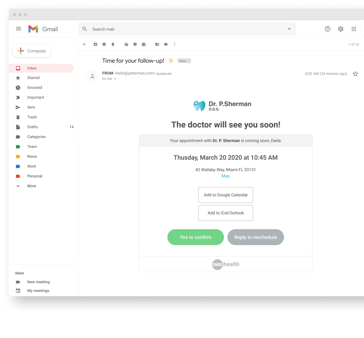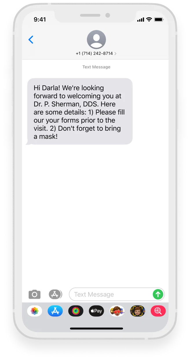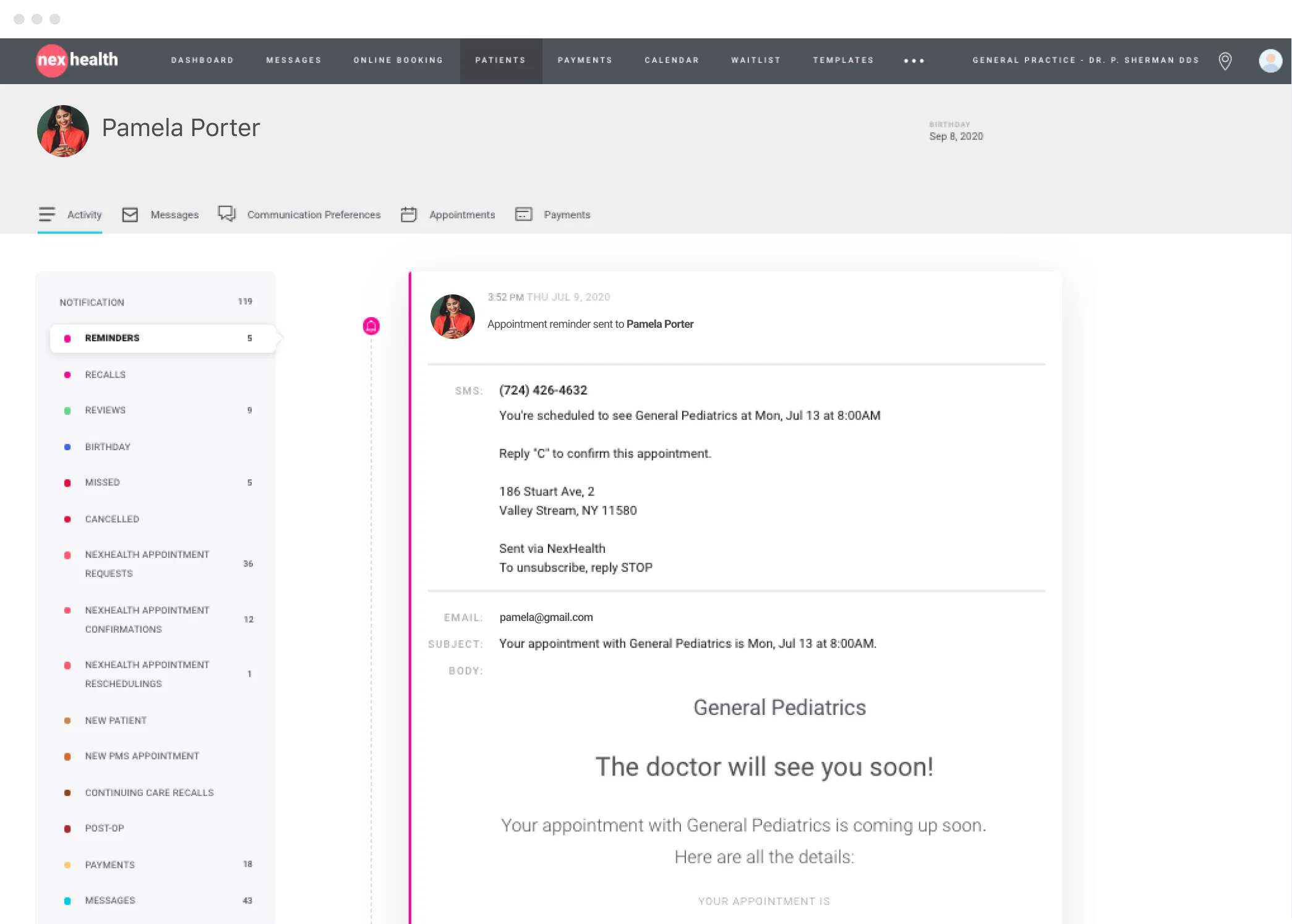 NexHealth sends text and email messages one week, two days, and two hours before the visit – or create your own cadence.