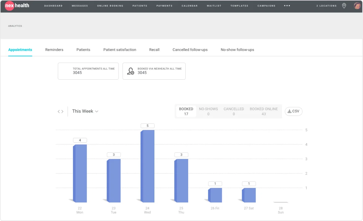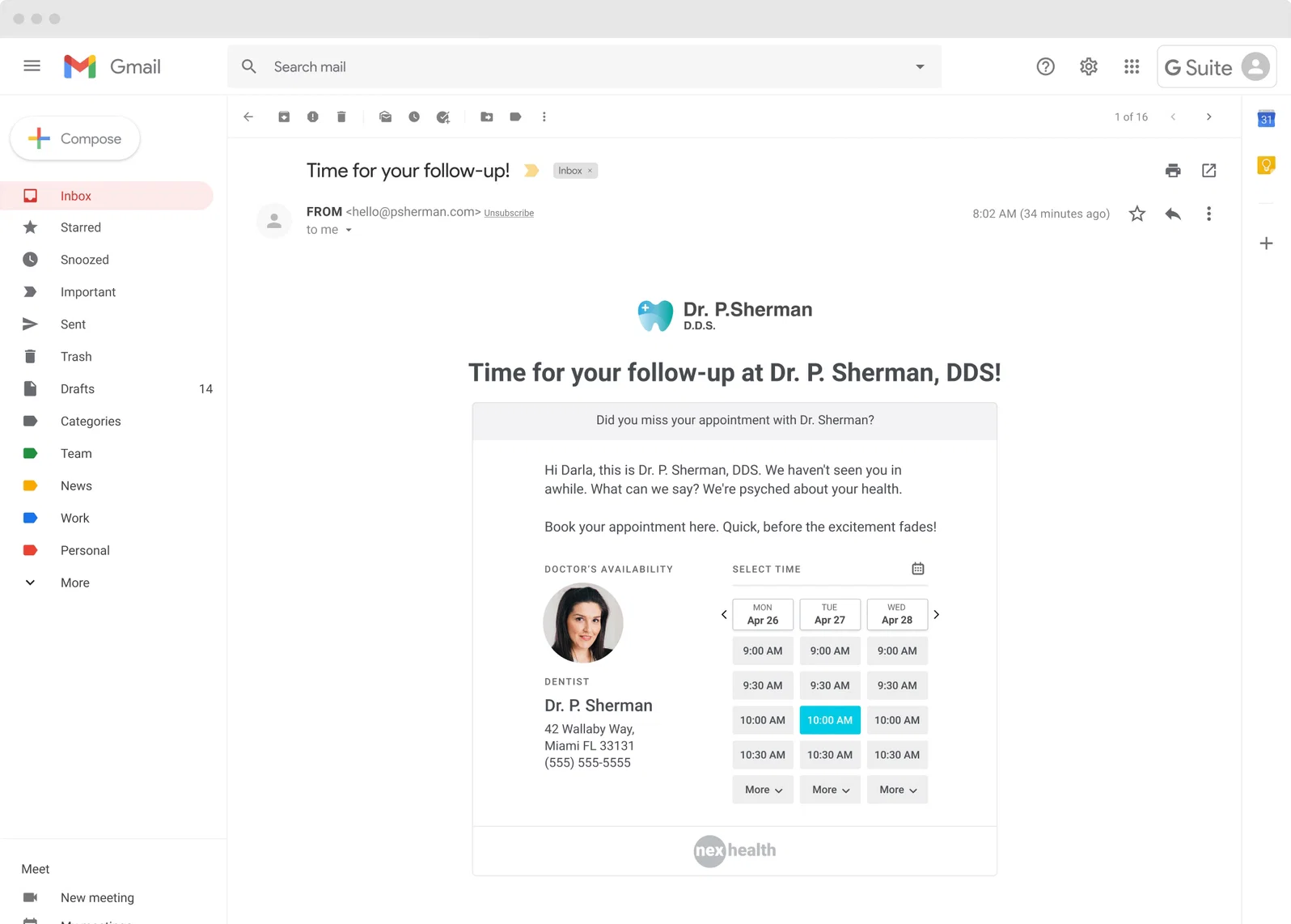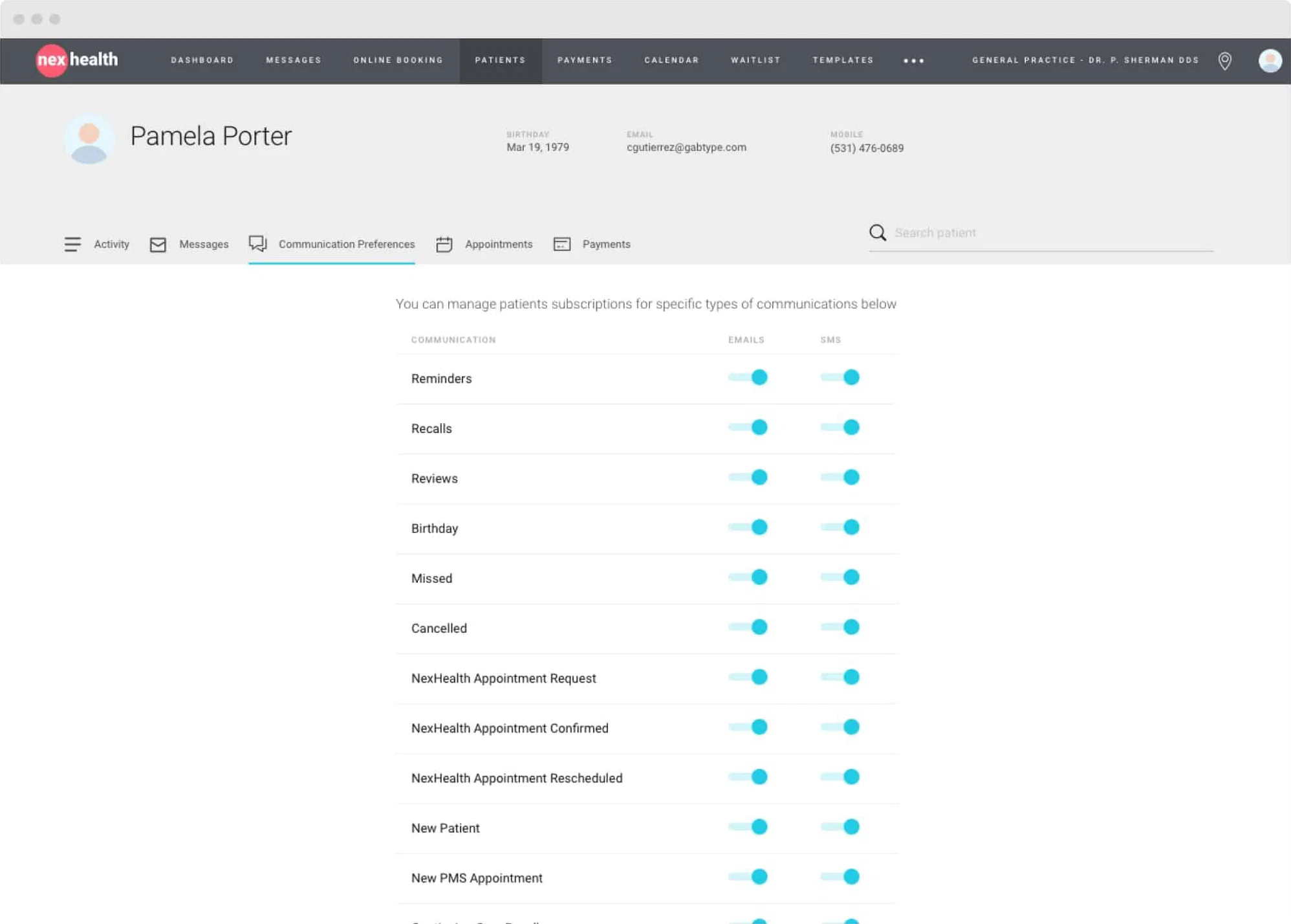 NexHealth sends text and email messages one week, two days, and two hours before the visit – or create your own cadence.