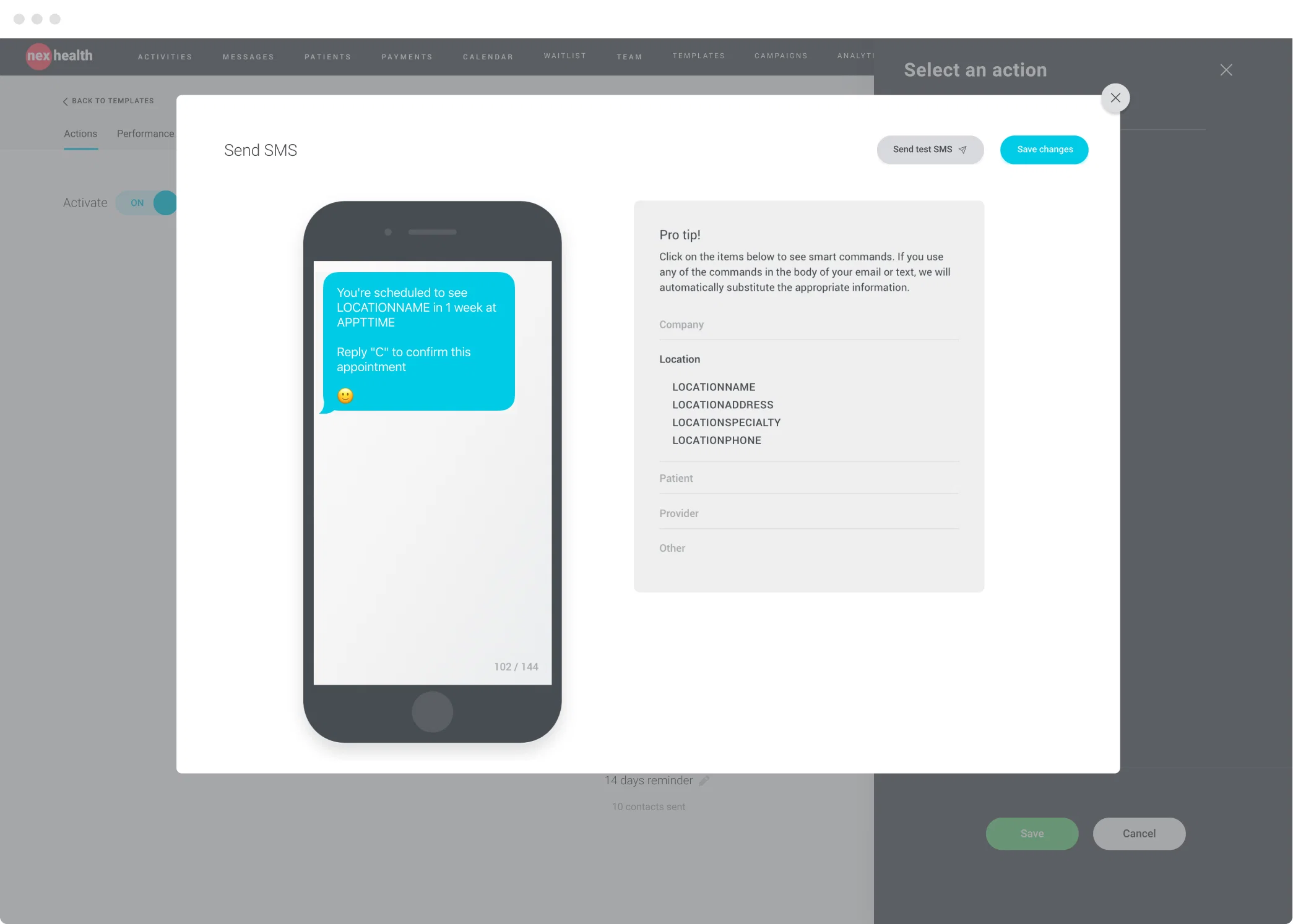 Smart Commands enable NexHealth to populate the practice name, patient name, confirmation button, and more.