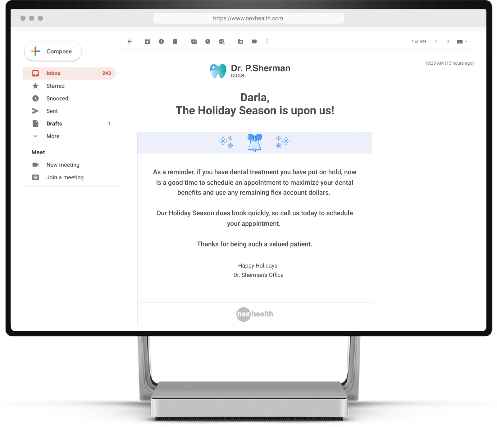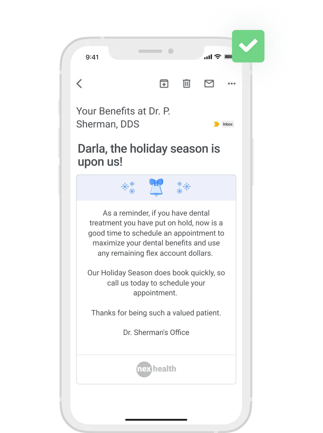 The best dental office marketing strategies speak directly to your patients, one-on-one. With NexHealth, customize your email marketing messages with your patients' first names, and even their birthdays. Track email engagement with built-in analytics, showing open and click rates to key in on which messages perform the best.