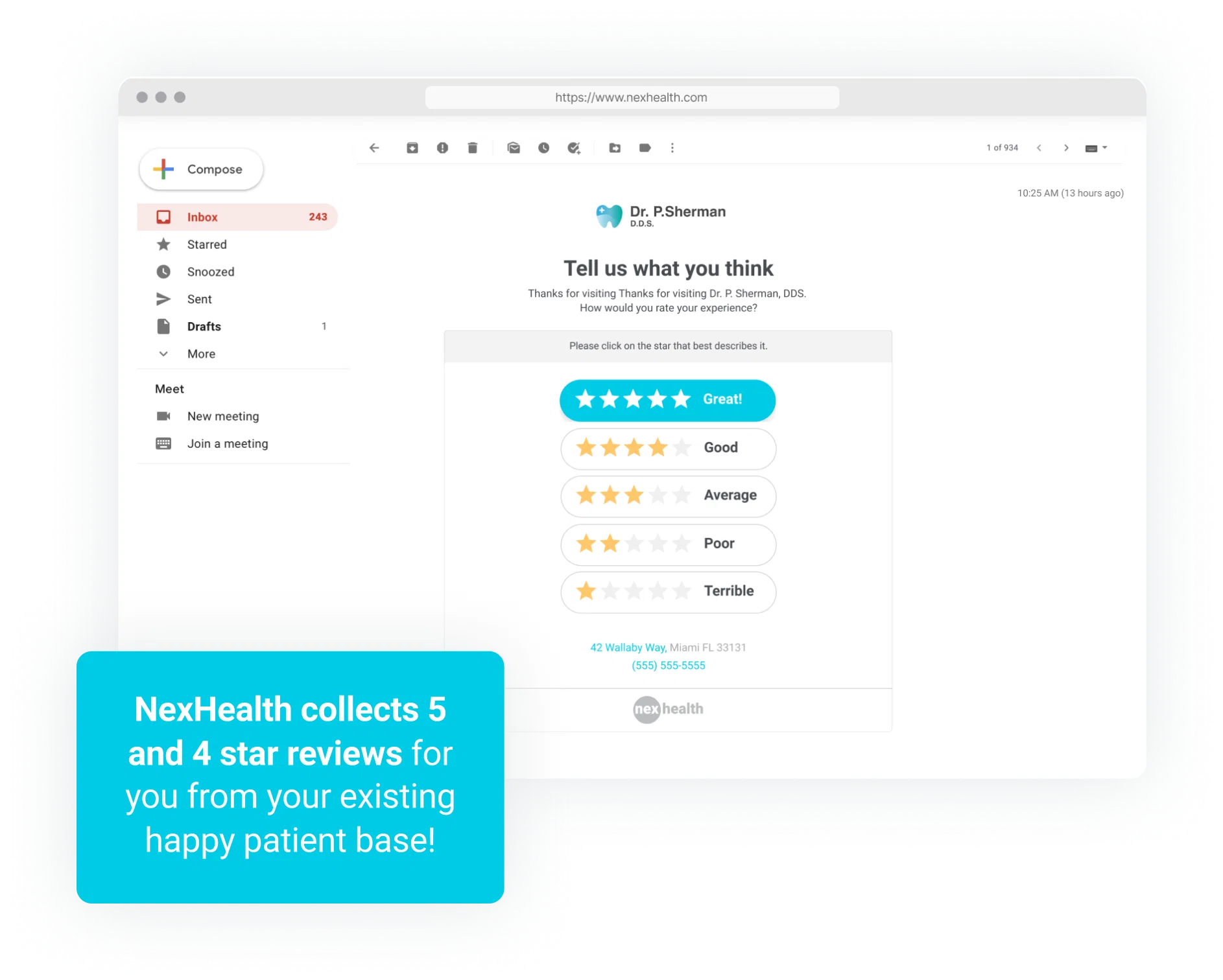 NexHealth makes it easy for your happiest patients to leave positive feedback online and generate interest for your services.